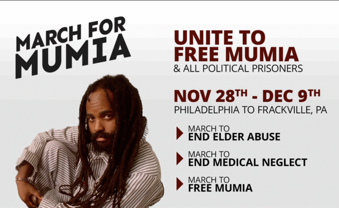 November 28 kicked off a 12-day, 103-mile march from Philadelphia to the front door of State Correctional Institute Mahanoy where journalist, former MOVE and Black Panther member Mumia Abu-Jamal has languished for 44 years. Supporters gathered at Uncle Bobbie’s Coffee and Books to begin the walk to the prison in Frackville. Abu-Jamal, now in declining health, has been held there since 2012 after his death row conviction was overturned and replaced with life imprisonment. Rally-goers will continue marching until Dec. 9, then hold a rally outside the prison. Education organizer Ant Smith spoke at the ‘Unite to Free Mumia” rally before they set off.